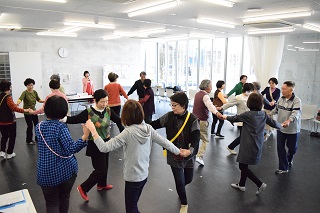 平成29年4月5日(水曜日)、おおたかの森センターでおおたかスマイルメイツ(代表・中河原悦子)主催のやさしい英語でリズミカルウオーキング(スクエアダンス)の初心者体験会が開催されました。英語に合わせて楽しく健康ダンスをテーマに活動する同会は、設立して1か月と始動したばかり。当日は、初めて参加された3人を含めて17人の方々が陽気な曲に合わせて踊りました。