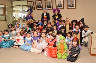 平成29年10月24日(火曜日)、ハロウィンの衣装を身にまとった小さなお客さんが市役所を訪れました。仮装をして登場したのは、「おおたかの森ナーサリースクール」のキンダースクールクラスに通う園児たちです。