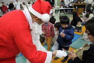 さらに学生さんがサンタに扮(ふん)して登場すると、一気にクリスマスムードが高まりました。ユニークなのはその学生さんのサンタに加え、公民館スタッフからもサンタが加わって、「俺が本物のサンタだ!」「いや、俺こそ」と掛け合いを演じ、会場の皆さんも大いに笑っていただけました。「きよしこの夜」を歌う中、2人のサンタが子ども達にプレゼントを渡し、コンサートはいよいよクライマックスを迎えました。