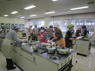 保健センターの栄養士が健康づくり講座・調理実習編の講師を務め、22人の方が参加されました。血糖値を下げるための4つのルールを学び、糖尿病予防のレシピをもとに5つのテーブルに分かれて、実際に調理を行いました。