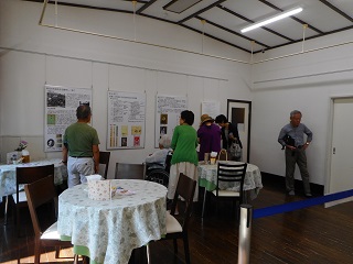 今回の企画展では、こうした秋元家の3人の活動や業績を解説パネルや写真などにより紹介しています。秋元松子の代表作である5点の絵画「くじゃく鳩」「絵のある静物」「花籠」「巣」「枯れ葉の詩」も合わせて展示。来館された方は、特に、松子晩年の作品である50号の大作「枯れ葉の詩」の前で足を止め、鑑賞する様子が多く見られます。
