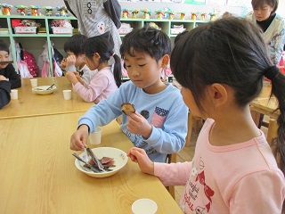 和食の基本である「出汁」の元となる昆布・かつお節・煮干し・干し椎茸を実際に触ったり、匂いをかいだりしました。「これが干し椎茸? 良い匂い」、「どれも、固いなぁ」と不思議そうな子どもたち。調理師さんから、「固いのは、お日様に当てて乾燥させたからです。水やお湯で戻すと、「うま味成分」が出て栄養たっぷりになるんだよ」と教えてもらいました。