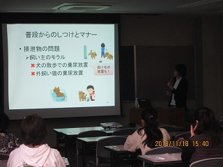 平成30年11月18日(日曜日)、生涯学習センター(流山エルズ)で、公益社団法人日本愛玩動物協会と流山市の共催による「流山市動物愛護セミナー2018」が開催され、ペットの飼い主やペットに関心のある方など約30人の方が参加しました。