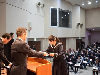井崎市長は「受賞おめでとうございます。これからも大きな夢と高い目標を持ち、挑戦を続けてください。この先、苦難や挫折することもあると思います。しかし、夢や目標があれば苦しいときに頑張れます。皆さんの才能・能力のさらなる開花を期待しています」と激励の言葉を贈りました。受賞者を代表して、平成30年度第24回東関東吹奏楽コンクール中学校の部B部門で金賞を受賞した北部中学校吹奏楽部3年の村上理子さんは「これまで数え切れないほどの努力をし、仲間との絆を深めてきました。そして、多くの方々の支えと応援があったからこそ受賞することができました。私達は今回の受賞に甘んじることなく、諦めない心とたくさんの感謝の気持ちを胸に、さらなる高みを目指してこれからも日々努力を続けていきたいと思います」と謝辞を述べました。