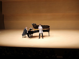 入場時間の3時間半前にホール入りした錦織健さんは、爽やかな笑顔とともに開口一番「新ホールオープンおめでとうございます」とその伸びやかな声で、あいさつし、真新しい楽屋に入られました。その後、ピアノ伴奏の河原忠之さんも楽屋に到着し、その大きな体躯を深々と折り、オープンのお祝いの言葉をいただきました。2人は、挨拶をすませると早々にホール舞台に向かいリハーサルを行いました。客席にまだ人が入ってない静寂の中、錦織さんの声が響き渡り、楽屋入りのときの和やかな表情が一変し、お客様を迎えるプロの顔になっていました。