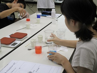 続いて、高分子と一緒に塩や砂糖を入れると、膨らむかどうかの実験をしました。砂糖のみのものはパンパンに膨らみ、砂糖と塩を入れたものの3分の2ほど膨らみました。実験の結果、高分子が膨らむことを阻害しているのは塩であることが分かり、子どもたちは驚いている様子でした。最後に高分子を使った芳香剤作りに挑戦しました。高分子が、吸い込んだ水を蒸発させることを利用し、好きな色を高分子や香料と混ぜて思い思いの芳香剤を完成させていました。
