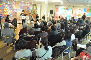 また、同日の午後には、「手話つきギャラリートーク&ギャラリーミニコンサート」が行われ、トークゲストとしてAOAart代表理事の藤島大千さん、4月2日の世界自閉症啓発デーなどでもご協力くださっている「2018日本ミス着物」の岡部七子さん、ディスレクシアのバイオリニスト・水沼陸さんらがお話や演奏を披露してくださいました。会場には、多くの関係者や絵画ファンが詰め掛け、絵画を鑑賞し、演奏やトークに耳を傾けていました。