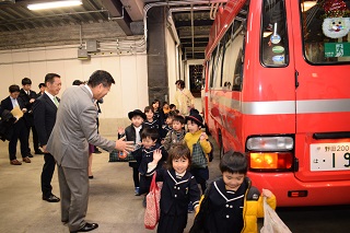おおたかの森送迎保育ステーションでは、市内の各保育園から降園の様子を視察。平成19年から始まったこのシステムは、先進的な登園・降園の取り組みとして視察の多い施設です。送迎バスから降りてきた園児たちは元気よく「こんにちは‼」と衛藤大臣や井崎市長にあいさつしたり、笑顔でハイタッチしたりしながら、保護者のお迎えを待つ保育室へと向かっていきました。