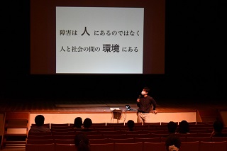 午後に行われたバリアフリー研修では、「誰もが参加できる環境づくり」をテーマに、一般社団法人日本障害者舞台芸術協働機構の南部充央さんによる講演がありました。障害者が社会参加するにはどうしたらよいか、障害についての概念を変える工夫、障害が「人にあるのではなく人と社会の間の環境にある」という説明に、参加者の皆さんは真剣な表情で耳を傾けていました。「今まで障害者とは障害を持っている「人」のことだと思っていたけれど、それを生んでいるのは周りの環境だと実感しました。これからは考えを変えて、みんなで楽しめるような演劇を作りたいです。せっかくの楽しみを皆で共有したいです」と感想がありました。