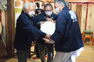 「とう渡し」が終わると、いよいよ上半身が裸の男衆による餅取りです。しかし、今年は新型コロナウイルスの感染拡大のため、拝殿内で当番の皆さんによる餅取りに変更されました。
