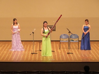 曲の合間には、各楽器の紹介とソロによる短いメロディの演奏がありました。ファゴットは管の全長は約3mもあり、左手の親指だけで11ものキーを操作するそうです。また、クラリネットは重厚感のある低音から高音まで音域が広く、吹奏楽やオーケストラでは主役級の活躍をし、フルートはヨーロッパで旧石器時代から演奏されていた横笛が起源とされる歴史深い楽器との説明がありました。どの楽器も木管楽器ならではの温かみのある音色で観客の皆さんを魅了しました。
