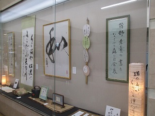 ぐるっと流山 森の図書館 ギャラリーガラスケース展示 茂野柰園の書となごみの森の句会展