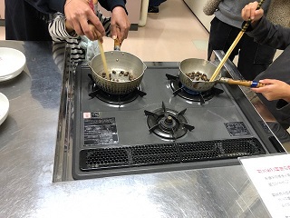 調理室に戻ると実際に食べれるどんぐり、マテバシイとスダジイと山栗を炒って試食しました。「リスの気持ちが分かった」「やっぱり栗がおいしい」などかわいい声も聞こえました。集められたどんぐりは、アスファルトに底面を擦ってコマ作りや会議室でキーホルダーを作りました。参加者アンケートでは「驚きと発見を親子で楽しめた」「子どもがイキイキとしていて参加してよかった」「親が楽しめた」などの声がありました。