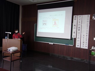 講演会では、赤ちゃんのための絵本から幼年童話、ファンタジーや古典名作などのフィクション、ティーンズ向けの本と段階を追って紹介していただきました。児童書は必ずしも段階を追って読まないといけないという訳ではなく、どの段階からでも楽しめるので子どもの成長に寄り添って本を選んでいくことが大切です。また、近年、絵本は赤ちゃんから大人まで楽しむことができるメディアとなってきており、大人が子どもに関わるための“ツール”としても赤ちゃんとのコミュニケーションを図るためにぜひ活用してもらいたいというお話がありました。絵本を読んでくれる“場”が楽しく、読んでくれる大人が楽しんでいることが大事だというお話がとても印象的でした。