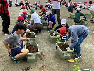 まず、同協議会の松島英雄名誉会長から土づくりの方法とゴーヤの定植について説明がありました。土づくりについて、プランター・花壇に培養土・堆肥・鶏糞・化成肥料を入れてよくかき混ぜるなど、緑のカーテンを上手に作るコツについて説明がありました。その後、子ども達はゴーヤクラブの指導のもと、土づくりや定植を力を合わせて行うとともに、牛乳パックに培養土を入れて、種まき、種からもゴーヤを育てる体験をしました。