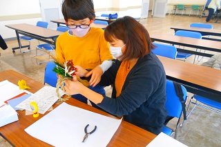 令和4年12月11日(日曜日)、中央公民館で親子で参加できる教室「お正月しめ縄リース作り」が開催されました。ブリザードフラワーの資格を持つ瀬戸山さちえさんを講師に迎え、予約をした5組10人の親子が参加しました。