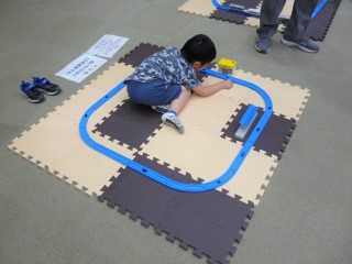 新型コロナウイルス感染拡大防止に配慮し、会場が密とならないよう事前予約制の2交代とし、プラレールやマットも家族単位に分けて配置しました。プラレール広場の参加者は、1回目は10家族、2回目は9家族でした。