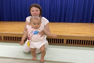 まず初めに恒例のお誕生日会を開催しました。今月お誕生日を迎えるお子さんは1人でした。お母さんに成長ぶりを伺ったところ「大きくなってくれて良かったなと思います。今は目が離せないですが楽しみたいと思います」と我が子の成長ぶりを嬉しそうにお話されました。そのあと記念写真を撮り、ハッピーバースデーの曲を流してお祝いしました。