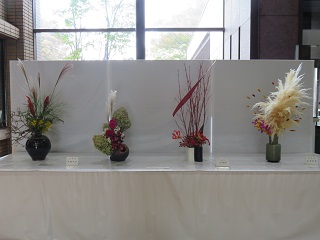 令和5年11月10日 (金曜日)まで、市役所1階ロビーで「四季の花々展」を開催しています。この展示は、流山市文化協会華道部(華道振興会)の協力のもと奇数月に開催しているもので、今回は「錦秋」をテーマに4点の作品を展示しています。