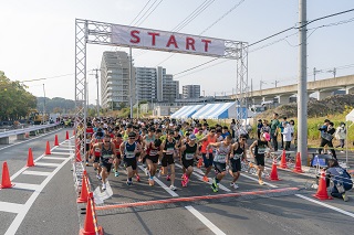 開会式が終わり、井崎市長によるスタートの号砲とともに、2,337人のランナーが一斉に飛び出しました。仮装姿で出走するランナーも見受けられ、沿道のギャラリーを楽しませていました。また、コース内に2カ所設けられた給水所では、ボランティアのほか、市内の中学生や高校生も協力しながらランナーを応援していました。