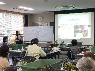 講習会の冒頭では、講師の玉村さんが活動されているガーデニングクラブ花恋人の会員の方と玉村さんのお庭の写真を交えながら、ガーデニングで工夫しているポイントや花の品種についてご紹介していただき、今回作成する寄せ植えの工程やポイント、苗の特徴についての説明がありました。