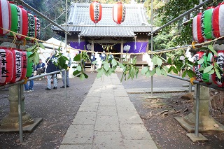 新年を迎えるために飾られたちょうちんが並ぶ参道には、ヂンガラ餅行事の日にだけ、しめ縄が飾られます。このしめ縄は、神域に入る人が自然と頭を下げて一礼する姿勢になるように、かがんで通り抜ける高さに飾り付けられます。