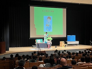 今回は、水と環境に関する実験やジャグリング、世界一のeco空気砲などのパフォーマンスが行われました。らんま先生の助手には参加者から選ばれた子どもや保護者が務め、一緒に実験を行い会場は大いに盛り上がりました。
