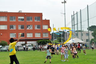 芝生広場に出た子どもたちは、できあがったばかりの凧を手に一列に並んで、遠藤さんの「せえーの」という掛け声で手を離します。この日の屋外は、微風という程度の風でしたが、「未来龍大空凧」は見事に風に乗ってあがっていきました。子どもたちの夢をのせた凧はぐんぐん空高く舞っていきます。子どもたちは、凧糸を交代で持ちながら、「あーっ落ちる!引け引け」と声をあげて大喜び。