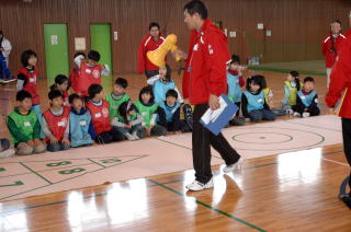 集まった小学生は、学年も学校も異なることから「自己紹介ゲーム」でスタート。5人1チームとなって、自分の前に自己紹介が済んだ人の名前を記憶して「Aさんの隣のBさんの隣のCです」というように紹介するものです。続いて、広げた新聞紙の上に風船を乗せて、風船が落ちないようにしながら速さを競う「新聞紙風船ゲーム」。