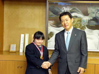 これまでの榎戸さんの並々ならない頑張りを伺った井崎市長は、「榎戸さんの可能性がもっと広がるように、そして世界大会出場という大きな目標に向かって練習に励んでください」と激励しました。榎戸さんも、「練習は楽しいです。これからも頑張ります」と元気に返事をされていました。ハンディがありながらも、高校の普通学級で学び、自分の可能性に挑戦しながら自立した生活をめざす榎戸美貴さんの今後のご活躍に期待します。