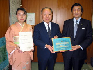 平成16年11月8日付けで国登録有形登録文化財に登録となった「呉服新川屋店舗」の登録証と登録プレートの交付式が2月10日に千葉県教育庁で行われ、式に出席した秋谷光昭さんが市教育委員会を訪れ、鈴木昭夫教育長に交付の報告をしました。