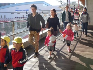 帰宅困難者の避難誘導訓練では、駅東口の商業ビル「ライフガーデン」4階の認可保育園「おおたかの森ナーサリースクール」に常設する「赤ちゃん避難コーナー」まで赤ちゃん連れのママやパパに落ち着いてゆっくりと避難してもらうための誘導練習が行われました。社会福祉法人高砂福祉会の篠塚弘子副理事長は、「親子で80~100人は一時的に受け入れ可能です」と話してくださいました。参加したママやパパは、「駅の近くにこのような場所があれば安心です」と話してくださいました。