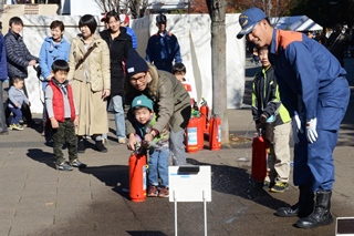 南口広場には防災体験コーナーが設けられ、来場者は、水道局の給水車による6リットルのリュック型ビニールパックを背負ってその重さを体験、消防署の起震車では震度7を体験するとともに、煙体験ではその怖さを実体験することができました。80センチメートルの水深や、がれきがあっても進むことができる警察の災害救助車には子どもたちが集まり、運転席に座って大喜びしていました。そのほか非常食の試食やAEDの訓練など、防災体験(NPO防災対策サポート)に多くの方が参加していました。