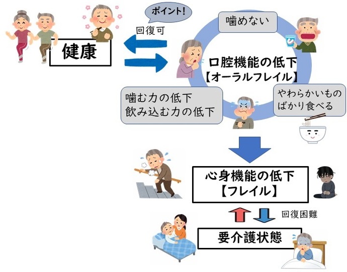 また、全身的なフレイル(心身の虚弱)へとつながり、ゆくゆくは要介護となってしまいます。