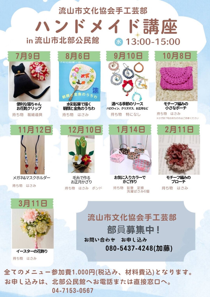 北部公民館で月回さまざまなジャンルの講師がハンドメイドの講座を受け持っているほか、会員一同心を込めた手作り作品の展示や、ワークショップを開催しています。皆様のおいでをお待ちしております。