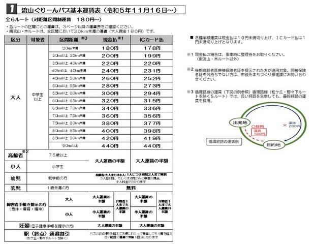 ぐりーんバスでは区間距離が3.0キロメートル以上で、500メートル毎に運賃(大人現金)が20円加算される。