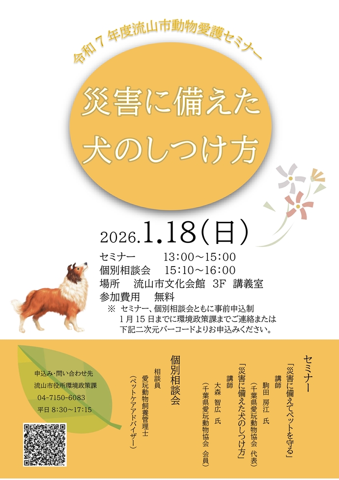 このセミナーでは、今後災害が発生した場合に飼い主はどのような行動を起こしたらよいのか、避難所生活において他のペットや人々と過ごすにはどのようなしつけを行ったらよいのかについて、専門家より講演を行います。